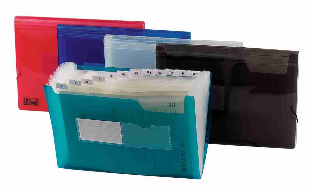 Voor A4 vellen (33 x 25,5 cm). Gemaakt van doorzichtig plastic. Met 13 vakken. Met 2 vakjes voor visitekaartjes. Met elastische sluiting. Geleverd met clips.