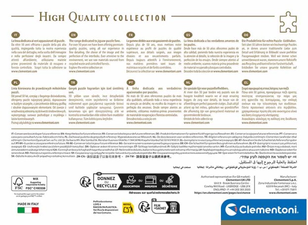 • 1000-delige puzzel Afmetingen van afgewerkte puzzel: 70 x 50 cm De aantrekkelijkste afbeeldingen, een grote verscheidenheid aan formaten en de kenmerkende kwaliteit van Clementoni zorgen voor een serie die een referentie is geworden voor legpuzzelliefhebbers over de hele wereld.