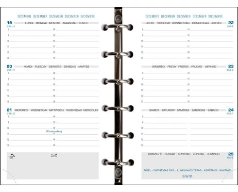 La semaine sur 2 pages à l’horizontale – amplitude horaire du lundi au samedi 8h-19h, espace de notes pour le dimanche. Papier blanc impression en bleu et gris. 4 fentes pour cartes + 1 fente pour glisser des papiers.