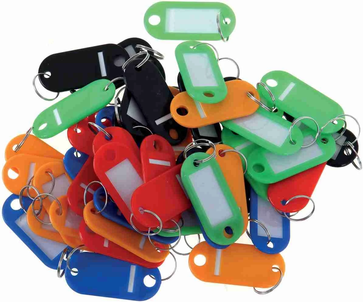 8046669 Porte-clés avec anneau. Ft 30 x 14 mm. Couleurs assorties (jaune, rouge, vert, noir et bleu). Etiquette d’écriture (ft étiquette 29 x 13 mm). Paquet de 20 pièces.