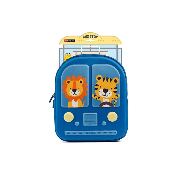 Ce petit sac à dos scolaire au design ludique représente un lion et un tigre en bus scolaire, pour accompagner les jeunes enfants dans leurs premières aventures.