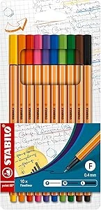Feutre à pointe fine point 88, étui carton de 10 hexagonal avec des rayures élégantes, pointe gainée de métal adapté avec l’utilisation de règles et de gabarits, résiste bien au séchage, capuchon ventilé, largeur du tracé: 0,4 mm contenu: 10 pièces (8810) assorti dans les couleurs: jaune, orange, rouge, rose, violet, bleu, vert clair, vert, marron et noir