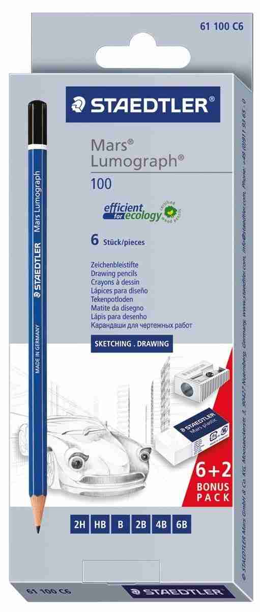 Mars Lumograph crayon graphite haut de gamme pour écrire, dessiner ou faire des croquis. Facile à effacer. Incroyable résistance au bris grâce à la formulation spéciale de la mine et au collage. Etui avec 6 graduations (2H-HB-B-2B-4B-6B) + taille-crayon et gomme Mars plastic mini gratuits.